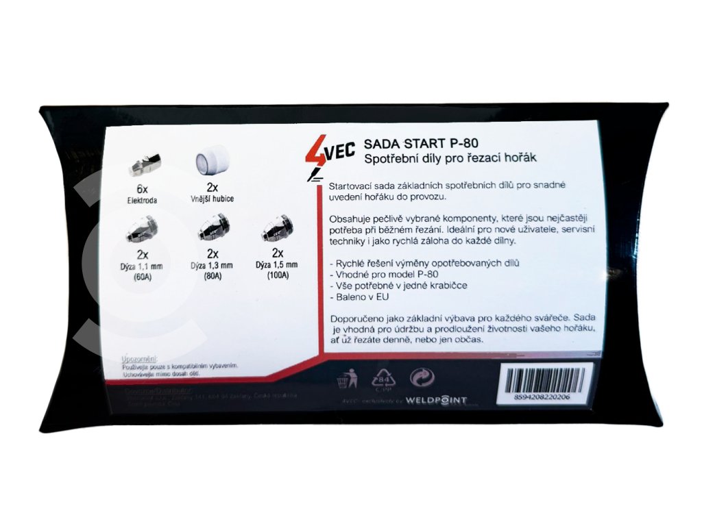Sada START P-80 je základní sada spotřebních dílů pro plazmové hořáky typu P-80, určená pro běžné plazmové řezání kovových materiálů. Obsahuje nejdůležitější komponenty, které se při provozu hořáku přirozeně opotřebovávají a mají přímý vliv na kvalitu řezu a stabilitu oblouku.
