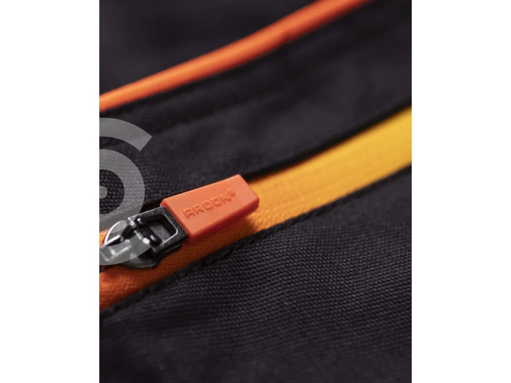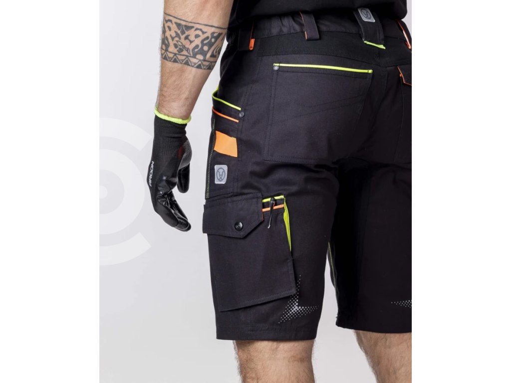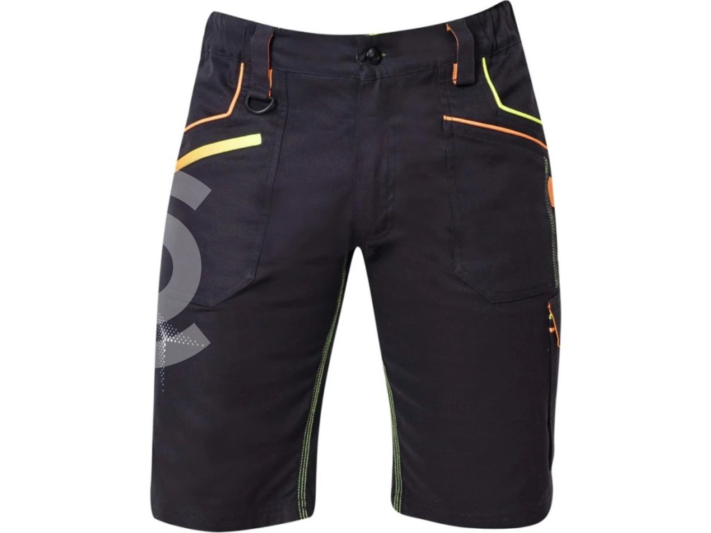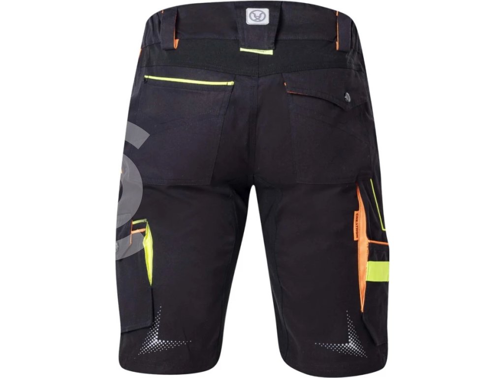 Strečové montérkové kraťasy ARDON® CREATRON® ve černém provedení s neonovými reflexními prvky, ergonomickým střihiem Slim Fit a odolnými výztužemi pro moderní a funkční vzhled i maximální pohodlí při práci.